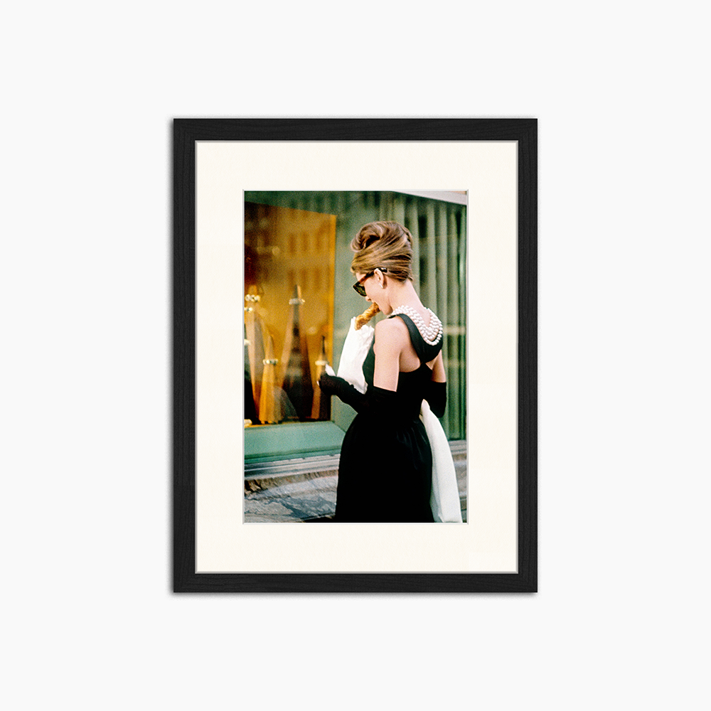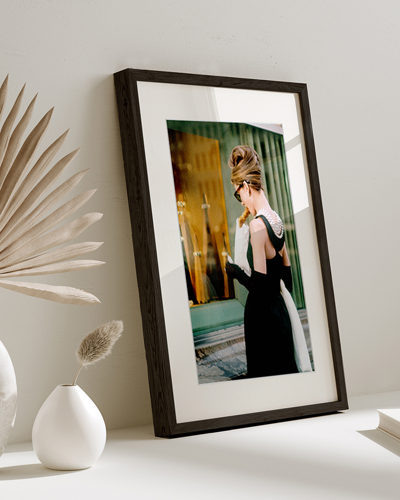 Eine bezaubernde Szene mit Audrey Hepburn als Holly Golightly, elegant gekleidet und im Morgengrauen in das Schaufenster von Tiffany blickend, deren vornehme Haltung und zeitloser Stil die ikonische Essenz von Frühstück bei Tiffany perfekt einfangen.