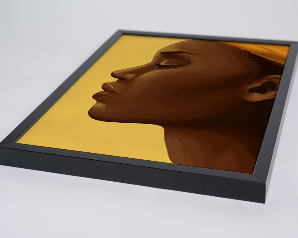 Das Bild ist ein digitales Gemälde des Seitenprofils einer Frau mit geschlossenen Augen, die einen ruhigen und entspannten Ausdruck zeigt, ergänzt durch die warme Farbpalette der Komposition.