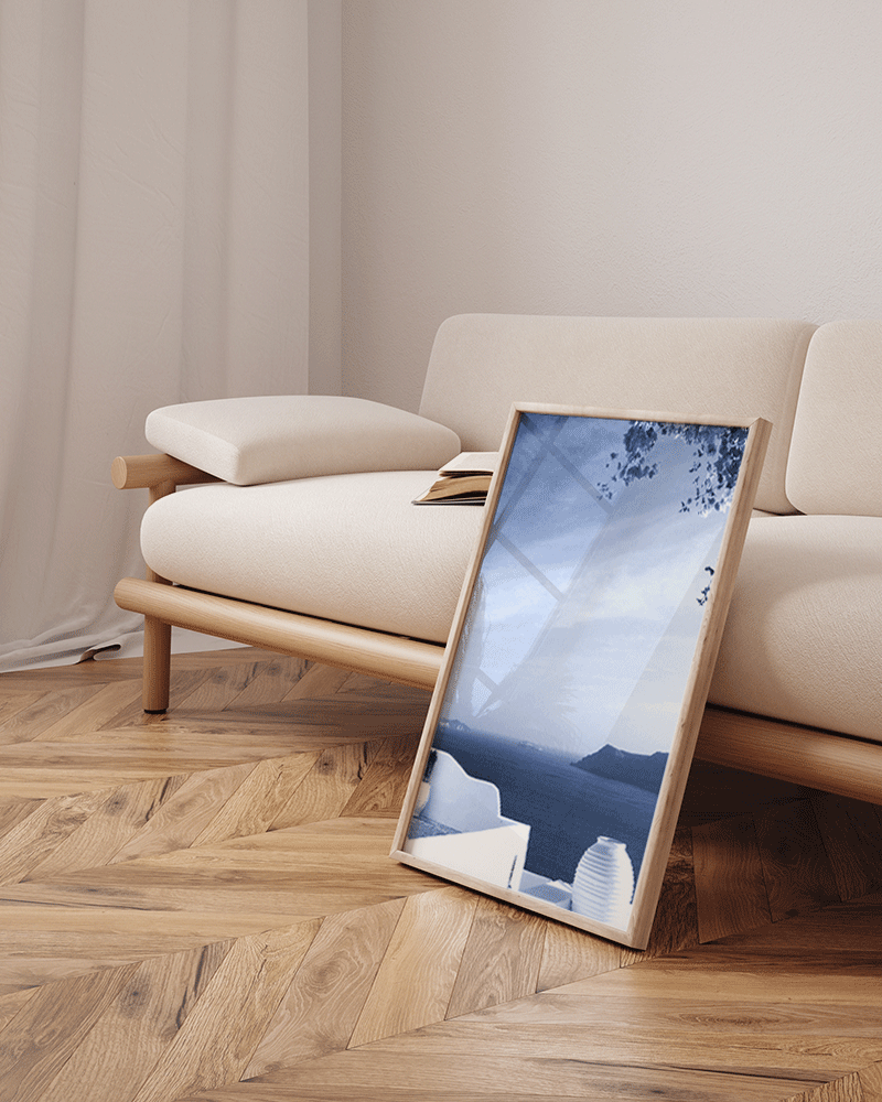 Hochwertiger Druck, Rahmen aus dünnem, natürlichem Eichenholz. Aufhängesystem inklusive.