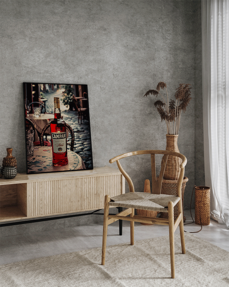 Eine Campari-Flasche auf der Straße vor urbaner Kulisse. Das Bild strahlt Raffinesse, Lebendigkeit und einen Hauch raffinierter, lässiger Eleganz aus.