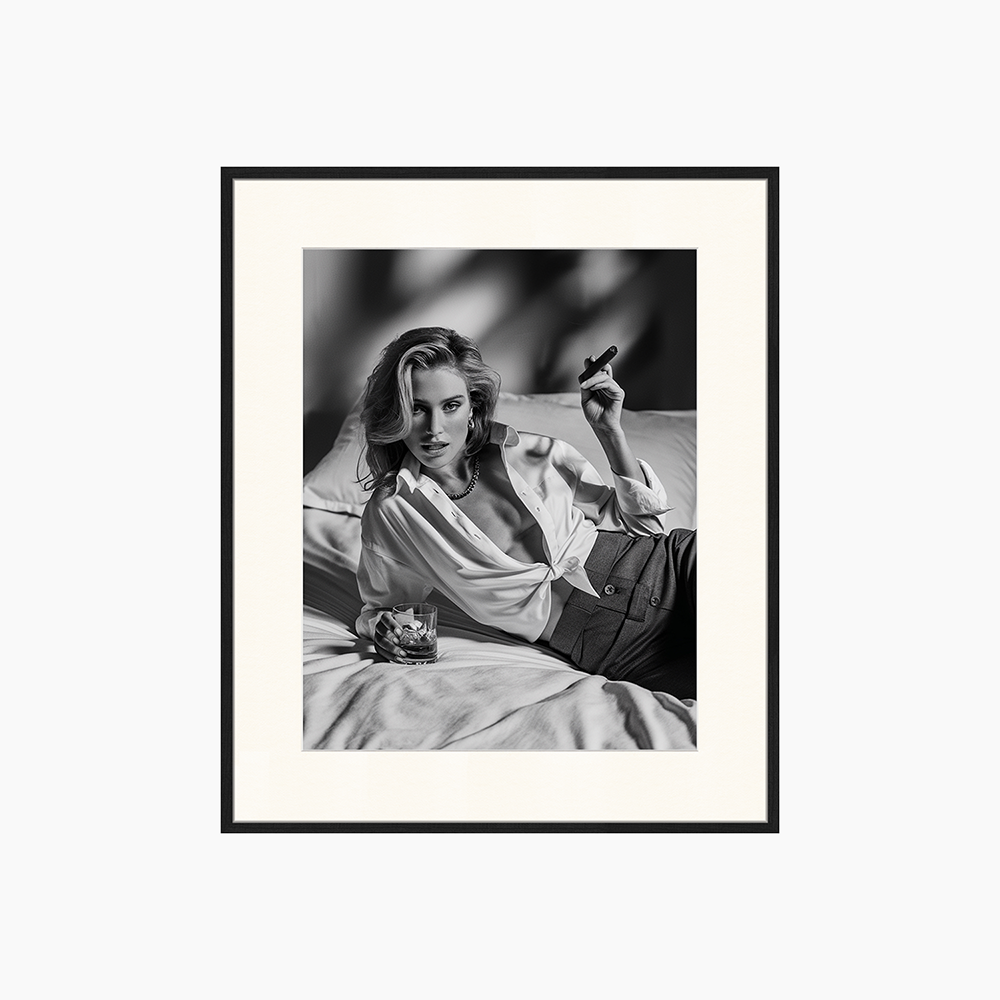Eine hübsche Frau mit wallendem Haar blickt verführerisch in die Kamera, in der einen Hand einen Whiskey und in der anderen einen Zigarillo. Das Bild strahlt Faszination und Selbstvertrauen aus.