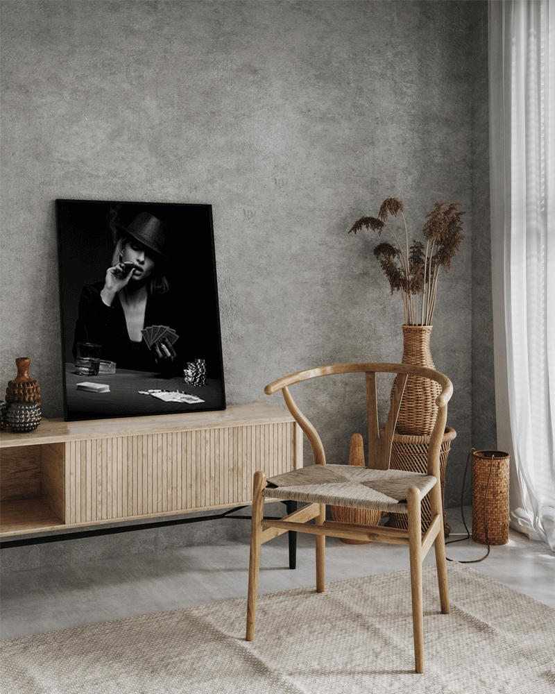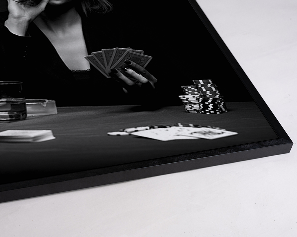 Eine Frau, die in einem dunklen Raum Poker spielt, umgeben vom Rauch ihres Zigarillos, vermittelt ein Gefühl des Geheimnisvollen. Verleihe dem Raum eine dramatische, anspruchsvolle Atmosphäre und elegante Intrigen.
