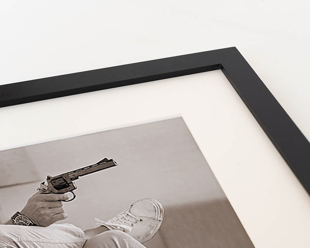 Hochwertiger Druck, Rahmen in schwarzem Buchenholz, mit Passepartout. Aufhängesystem inklusive.
