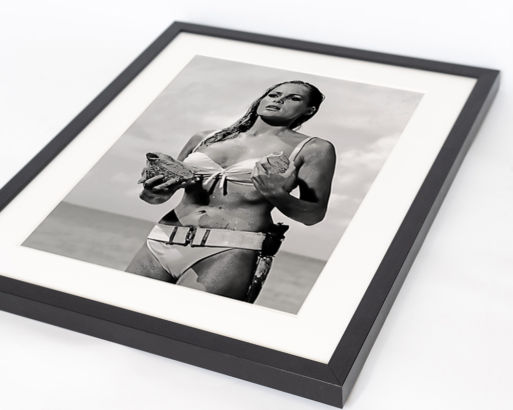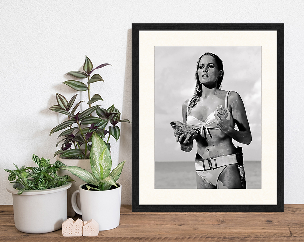 Ursula Andress als Honey Rider im ersten James-Bond-Film, Dr. No aus dem Jahr 1962. Der weiße Bikini, den sie trägt, ist berühmt geworden und gilt als ikonischer Moment in der Geschichte von Film und Mode.