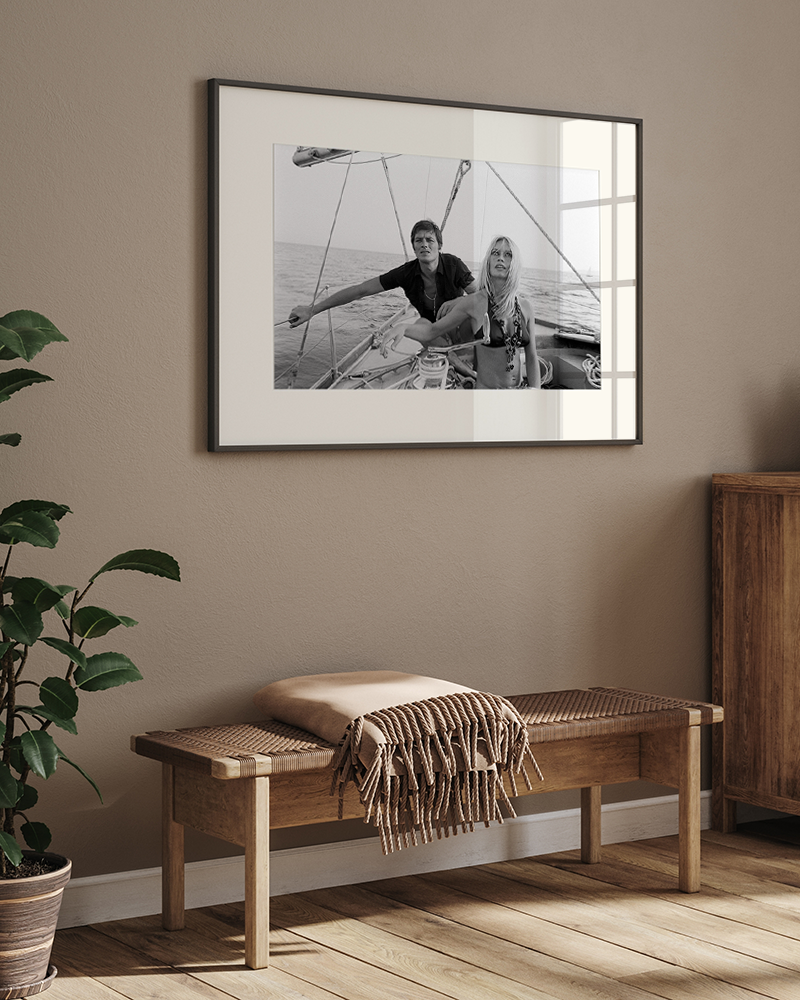 Alain Delon en Brigitte Bardot op een zeilboot in Saint Tropez, Frankrijk, augustus 1968. Brigitte en Alain hebben een goede band gehad. Maar de relatie tussen Alain Delon en Brigitte Bardot bleef altijd vriendschappelijk en niets meer dan dat.