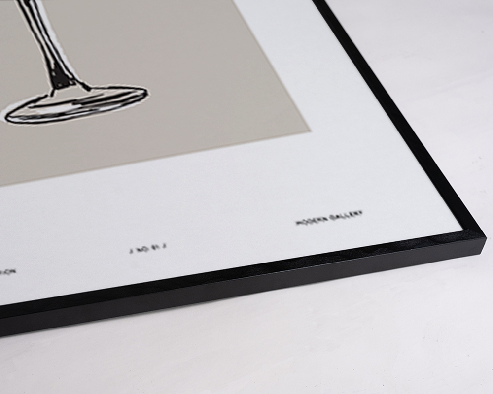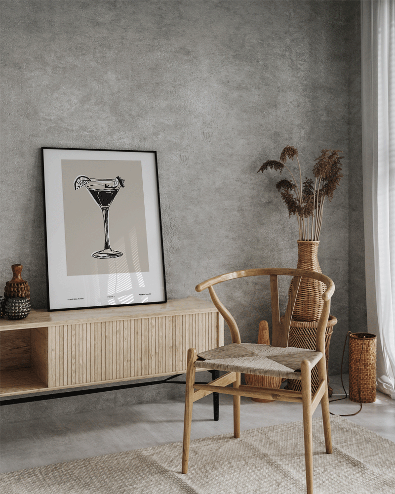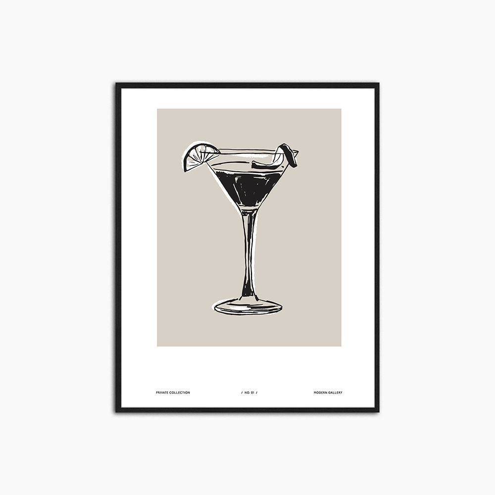 Een verfijnde zwart-witte illustratie van een Martini cocktail. Het glas heeft een limoenversiering op de rand en is geplaatst tegen een lichte achtergrond. Ook wanneer je niet van Marini houdt, brengt deze print van de beroemde cocktail sfeer in de kamer.