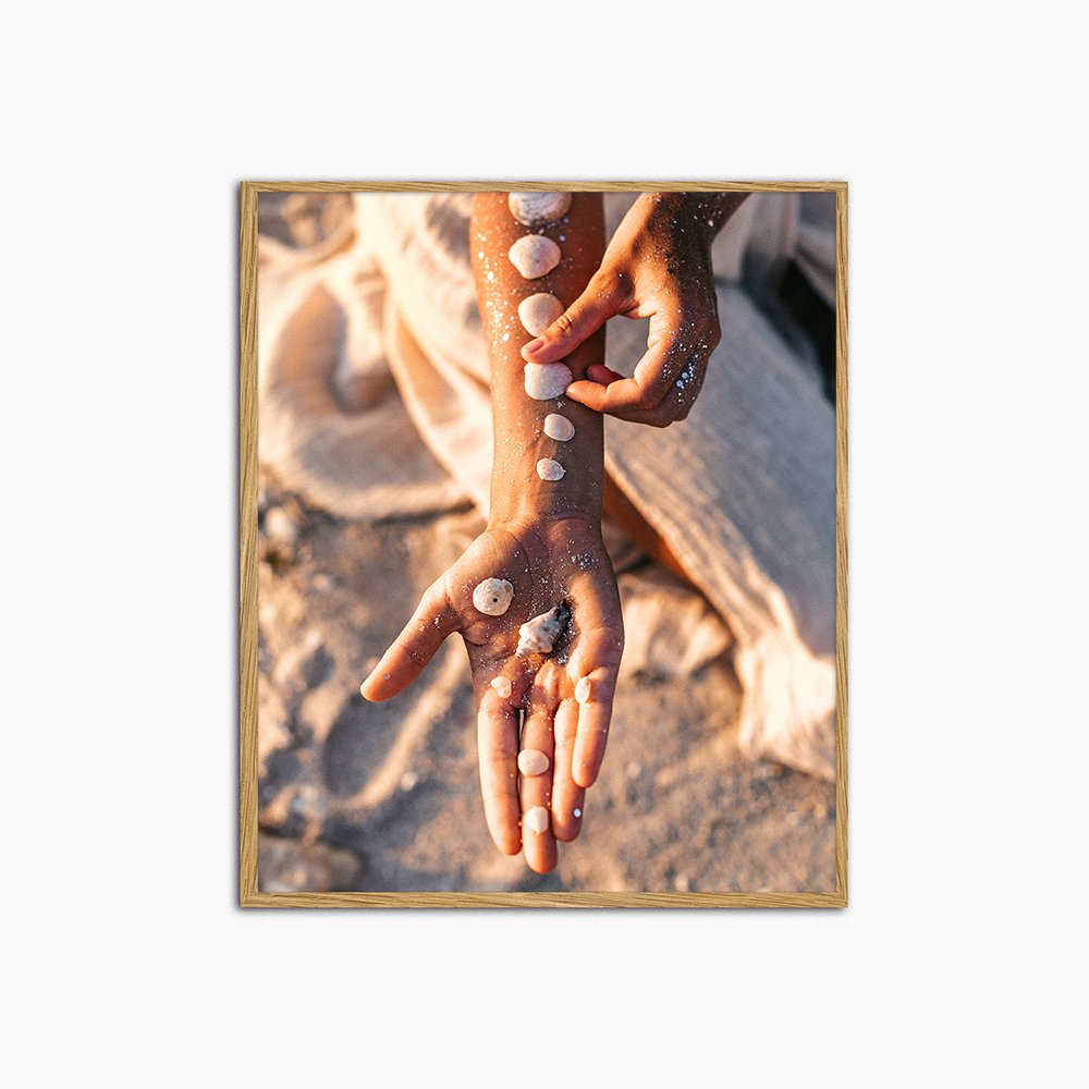 A woman playfully places seashells on her forearm. The scene radiates serenity and connection with nature, a tender snapshot on the beach.
