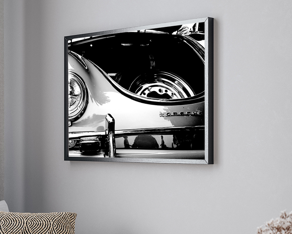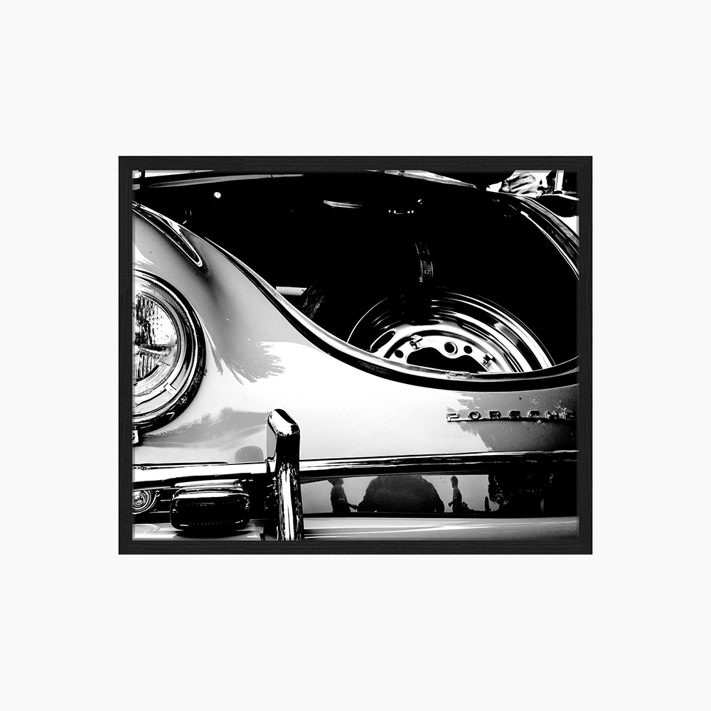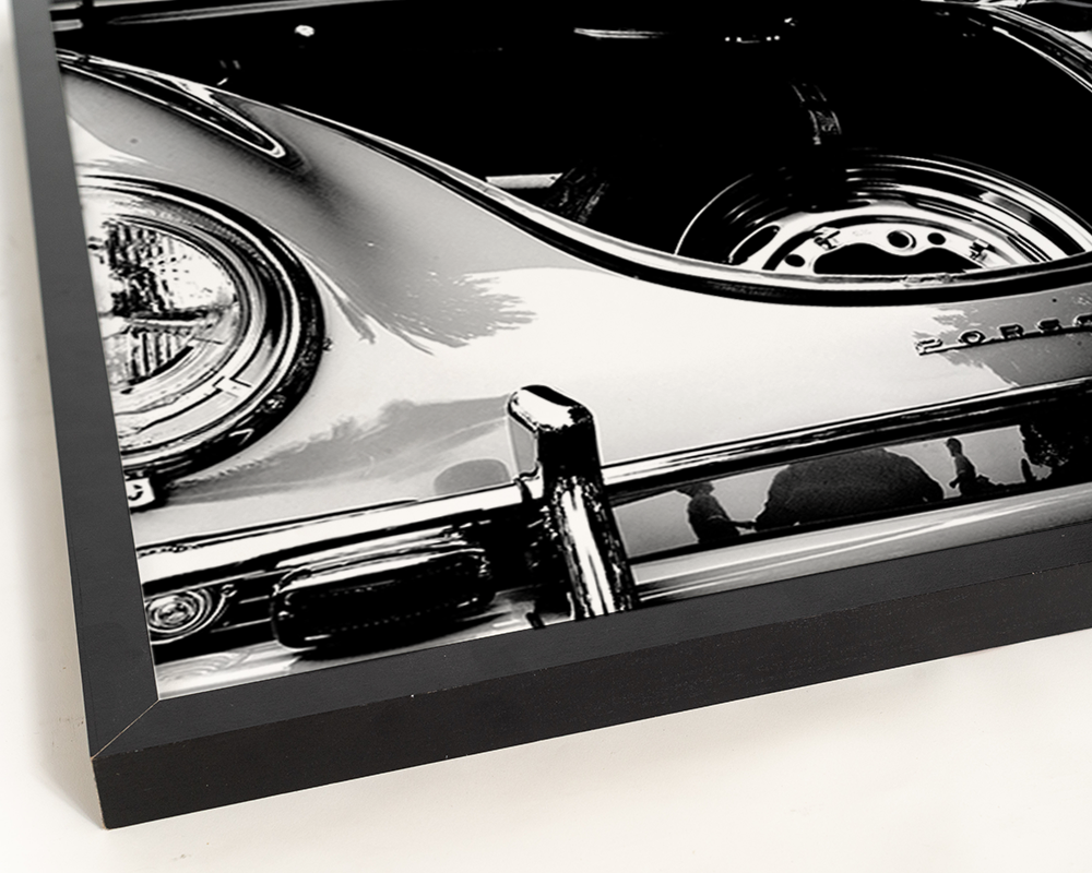 Deze zwart-witfoto benadrukt de klassieke uitstraling van de auto en roept een gevoel van nostalgie en vakmanschap op dat geassocieerd wordt met Porsche.