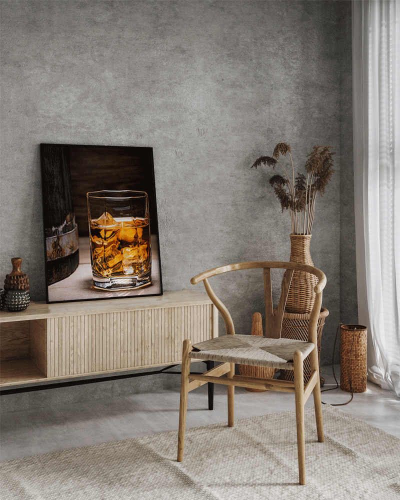 Een intens gekleurde whisky “On The Rocks” straalt rijke verfijning en warmte uit en brengt een vleugje verfijnde luxe en uitnodigende ontspanning in elke ruimte.