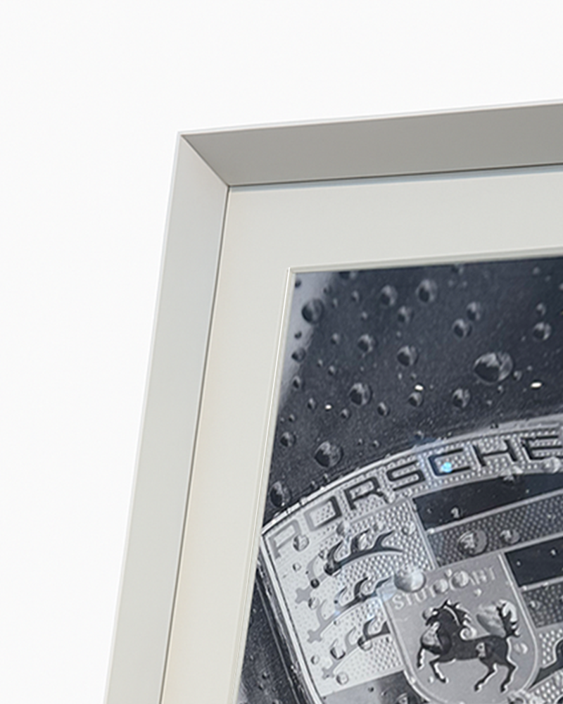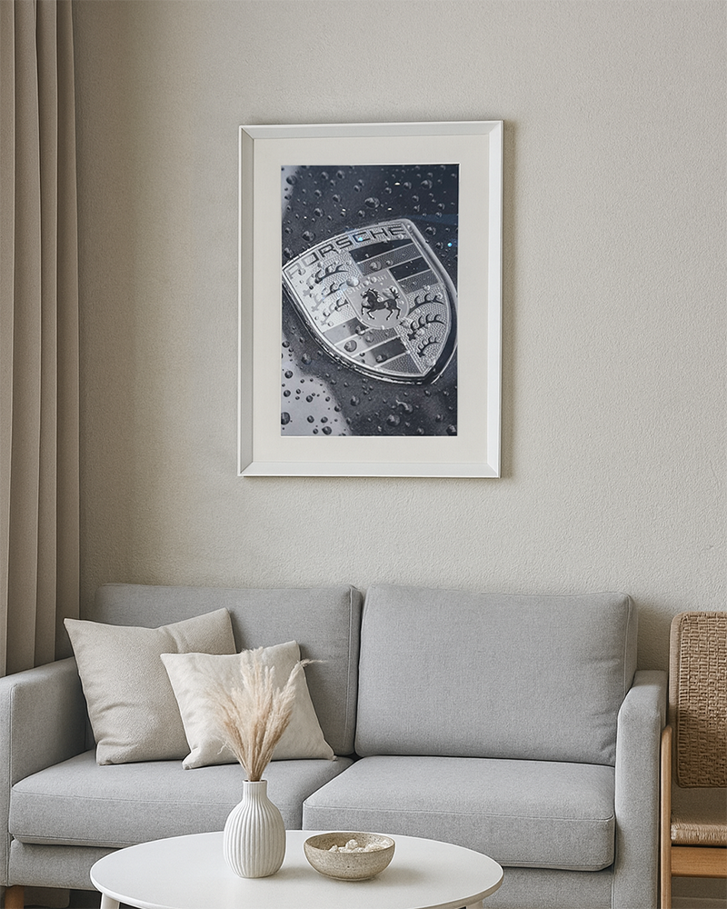 Close-up van het iconische Porsche-embleem, gedetailleerd en opvallend afstekend tegen het gestroomlijnde oppervlak van de auto. De monochrome toon versterkt de tijdloze elegantie en het klassieke gevoel van dit historische automerk.