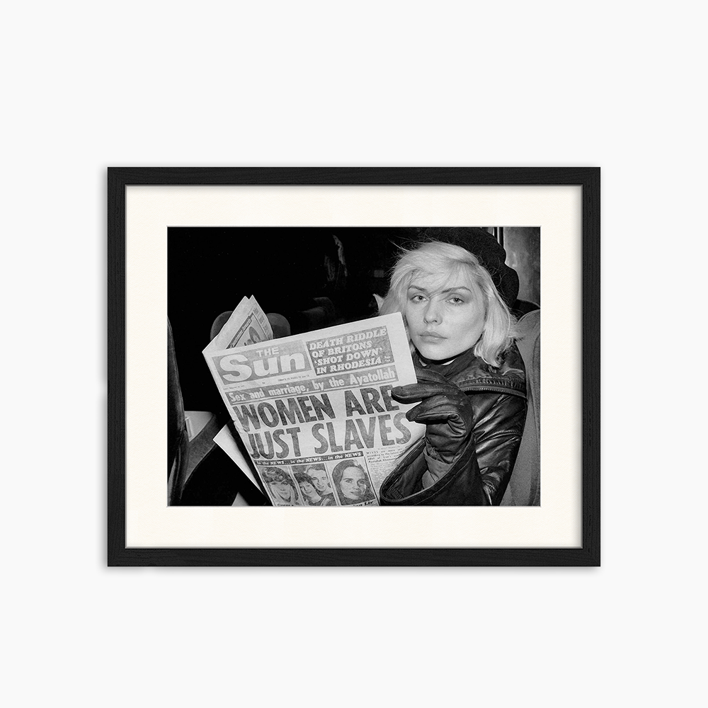 "Women are just slaves". Debbie Harry, zangeres vande wereldberoemde band Blondie, lijkt zich niet al te druk te maken om deze provocerende krantenkop. De foto is gemaakt in een trein eind jaren 70 door de gitarist van de band, Chris Stein.