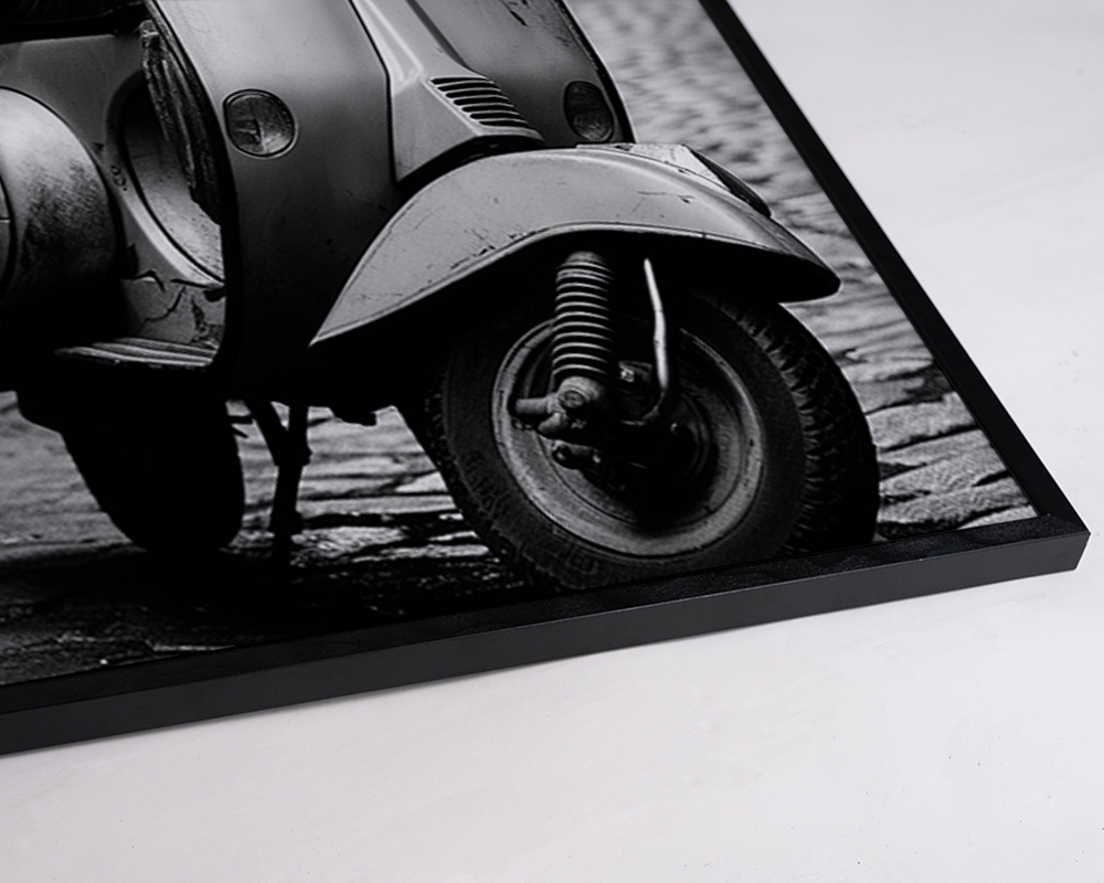 Een zwart-witfoto van een Vespa-scooter op geplaveide bestrating. Met retro elegantie en stedelijke charme.