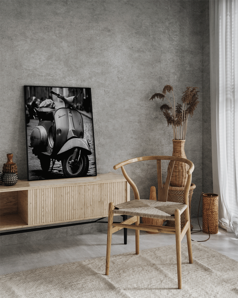 Ingelijste print in een smalle zwarte beukenhouten lijst. Ophangsysteem inbegrepen.