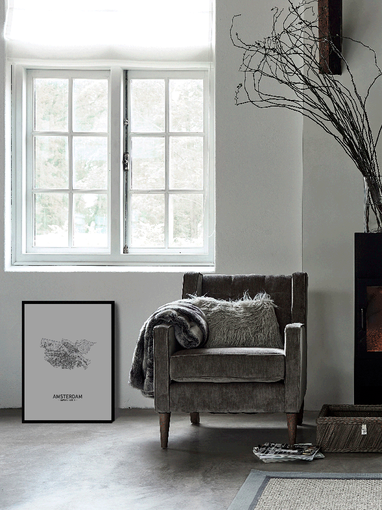 Black and white map of Amsterdam, a timeless tribute to one of Europe’s most charming cities, known for its canals, historic architecture, and creative spirit.