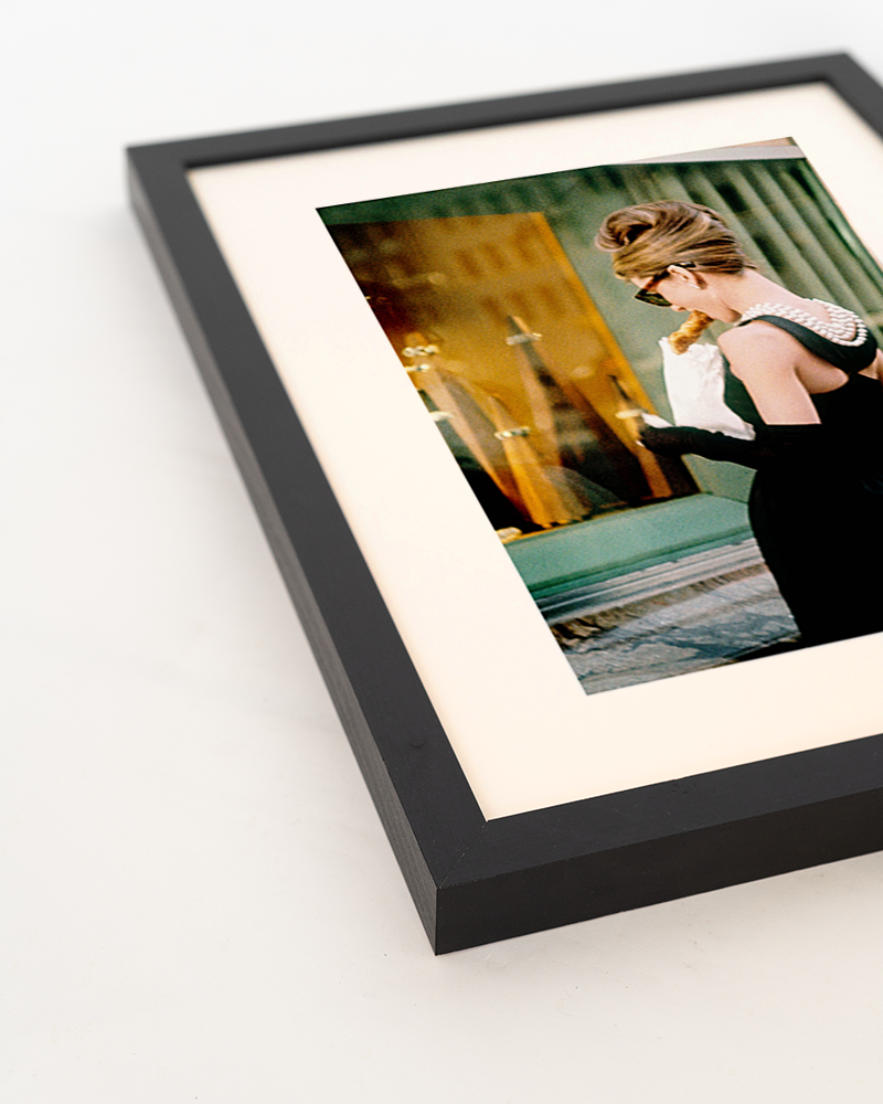 A charming scene of Audrey Hepburn as Holly Golightly, elegantly dressed and gazing into Tiffany’s window at dawn, her refined poise and timeless style capturing the iconic essence of Breakfast at Tiffany’s.