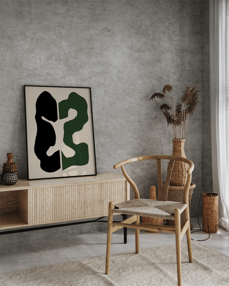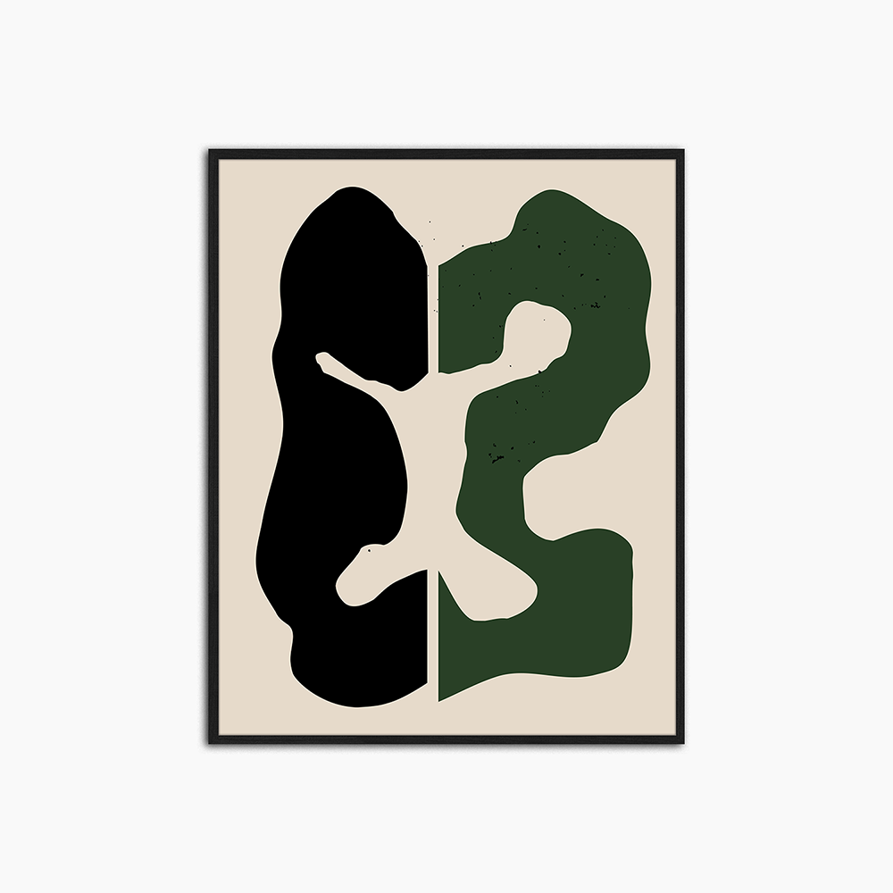 Abstract composition in which two black and green shapes are positioned opposit to each other. In contrast to the light color, these dark shapes stand out to the observer's eye.