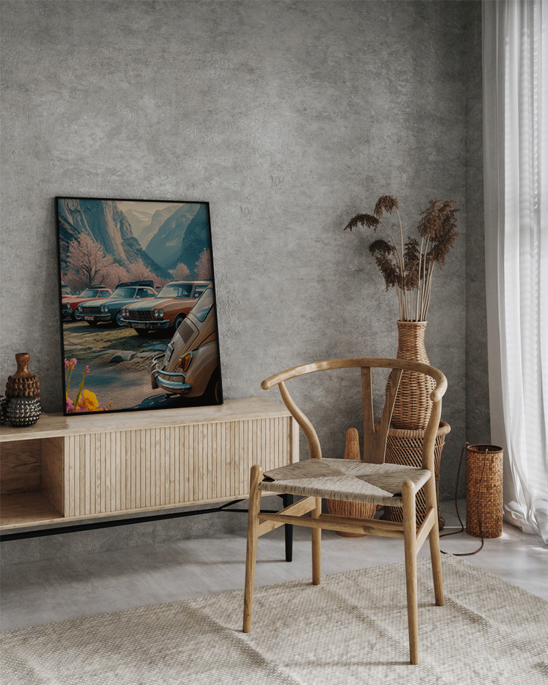 Oldtimers parked amid the Japanese Alps, surrounded by lush, mountainous scenery. The image conveys a blend of classic charm, and a sense of timeless adventure.