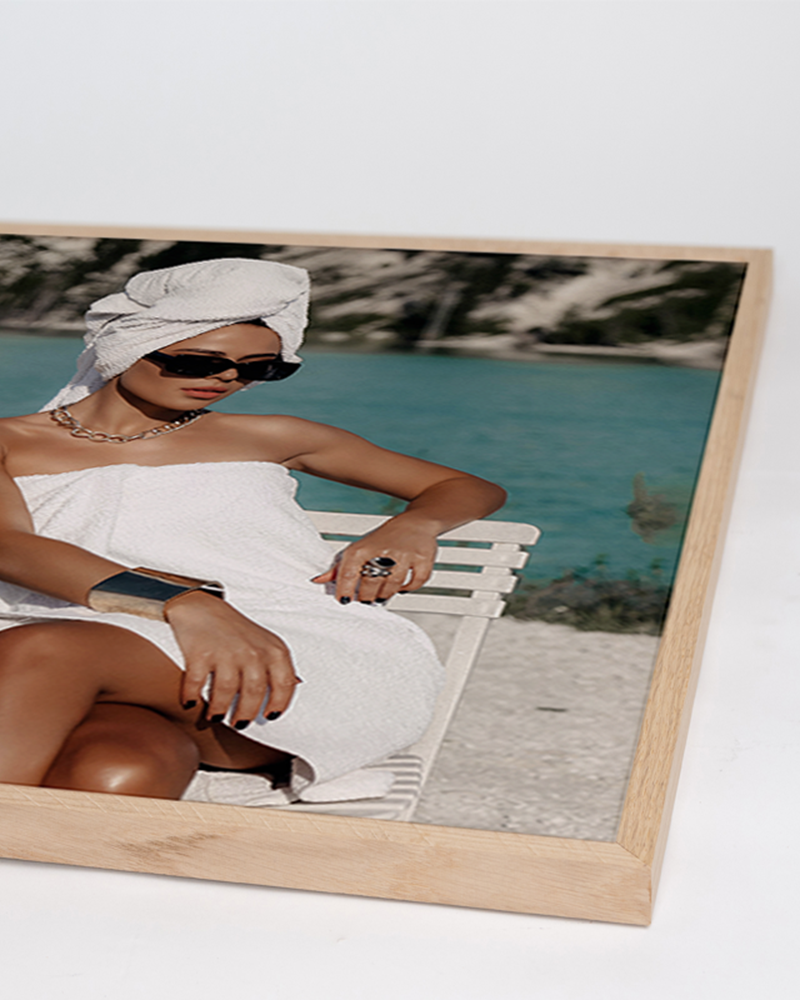 The combination of the towels, sunglasses, and necklace creates a unique and eclectic style, capturing a moment of both relaxation and fashion-forward expression. The overall ambiance of the scene suggests a blend of comfort and sophistication.