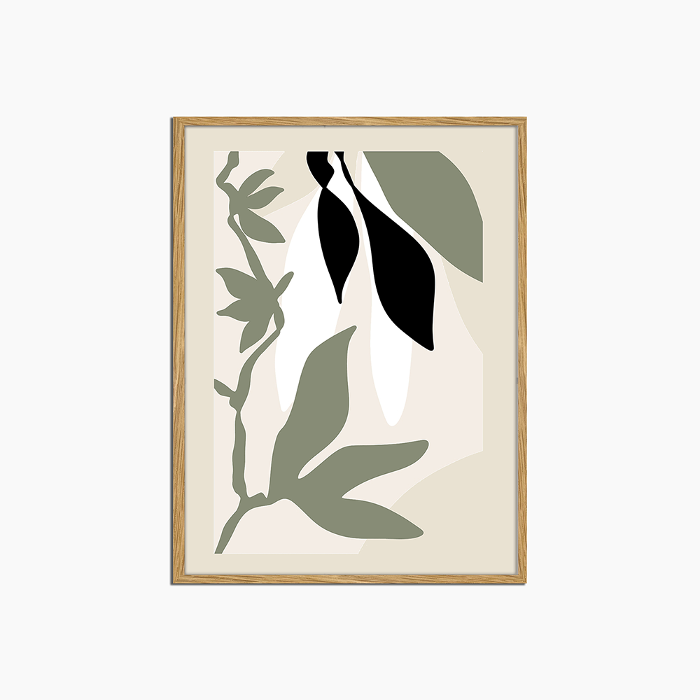 A plant-themed graphic design in a simplified line style. The image features leaves in various sizes in shades of black, white and olive. The leaves are arranged in a way that some overlap each other, adding a layer of intricacy to the naturalistic abstract design.