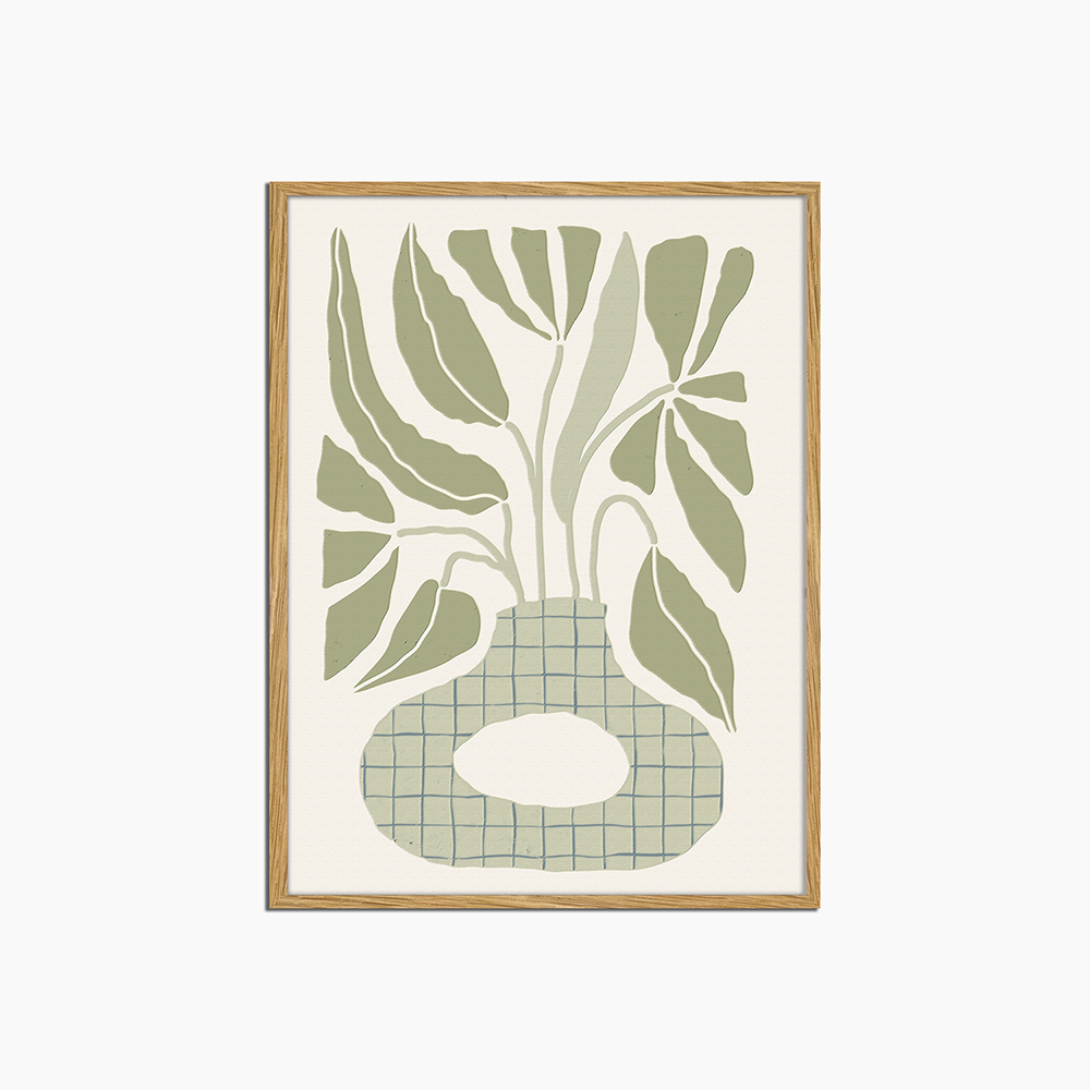 The image features a green vase with a grid pattern, with an abstract plant inside. The aesthetic is simple, with straightforward lines in soft green and beige tones, contributing to the overall natural and friendly atmosphere of the piece.