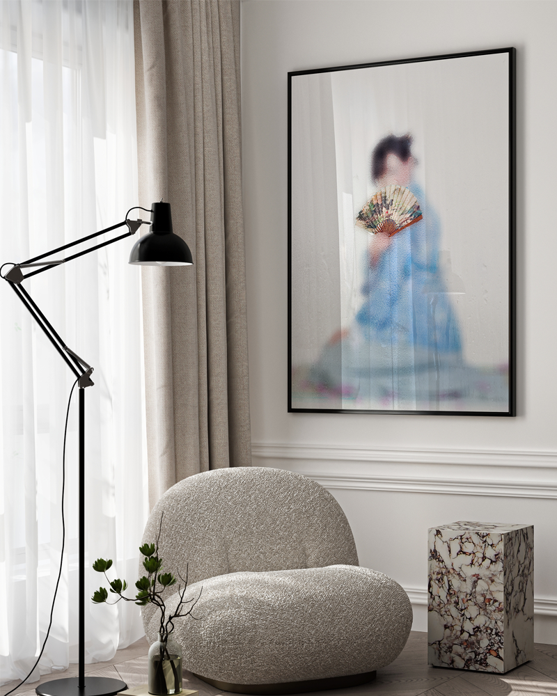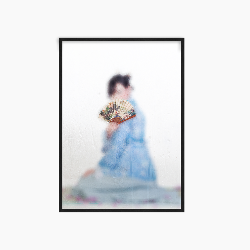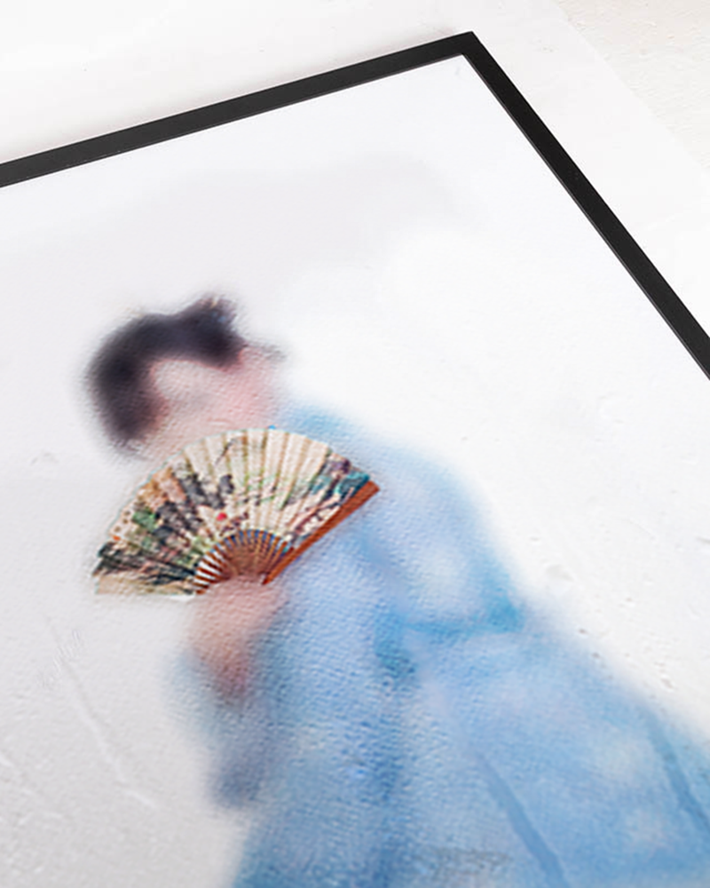 An intriguing image that creates a calm and serene atmosphere. The lady appears blurred, her features softened and hazy, in contraposition with the nitid hand fan with its intricate patterns and delicate construction.