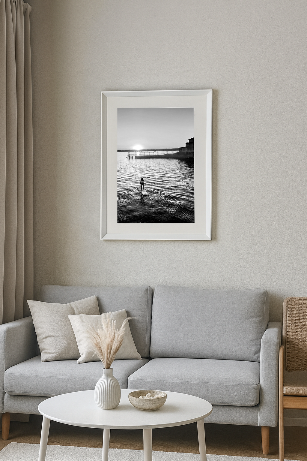 A striking black-and-white photograph captures the silhouette of a person paddle surfing across calm waters as the sun sets. The fading light casts soft reflections on the water's surface, creating a serene atmosphere.