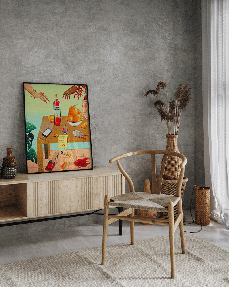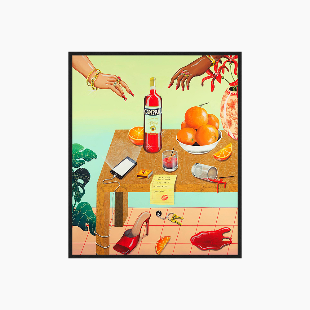 An abstract, colorful image of a Campari bottle on a party table, with two women's hands reaching to grab it. Highlighting the bittersweet essence of life.