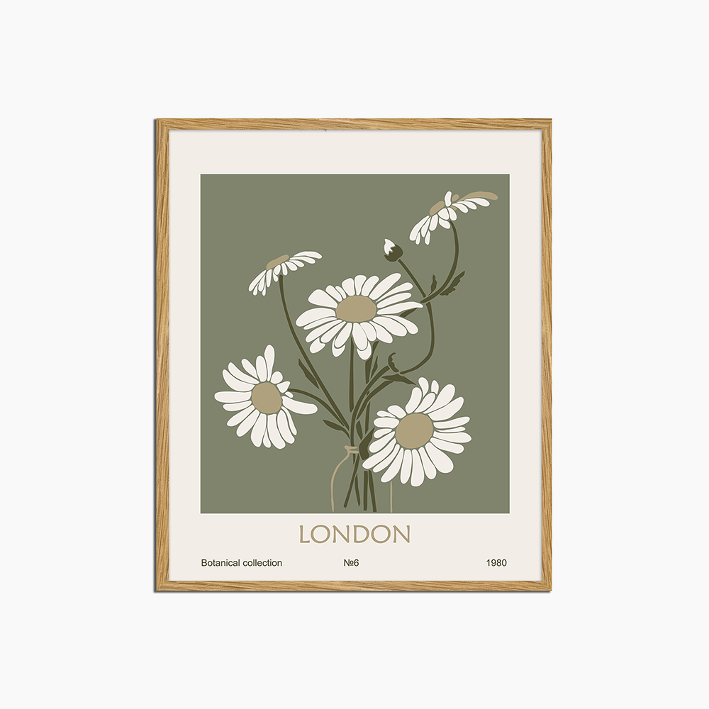 A vintage bothanical poster featuring a collection of white daisies tied together with a bow, set against a green background.