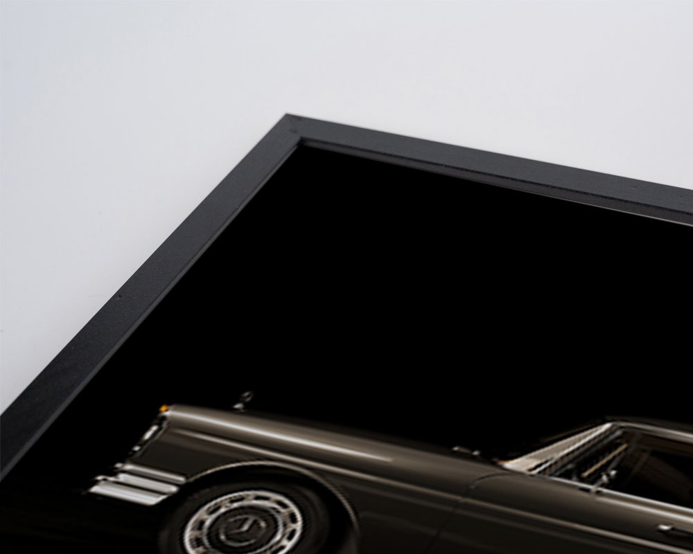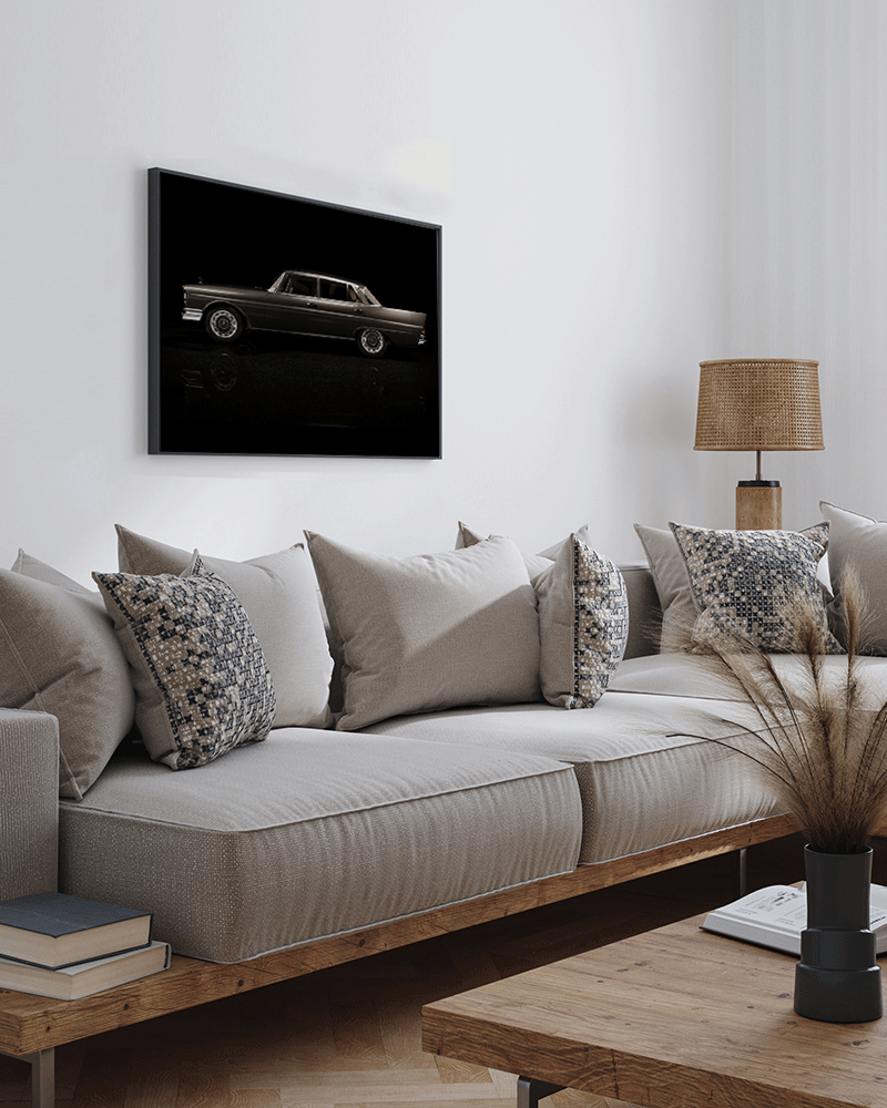 The image depicts a polished, silver, vintage Mercedes-Benz in the center of a composition against a solid black backdrop, providing a stark contrast, and lending a distinctive classic and timeless atmosphere.