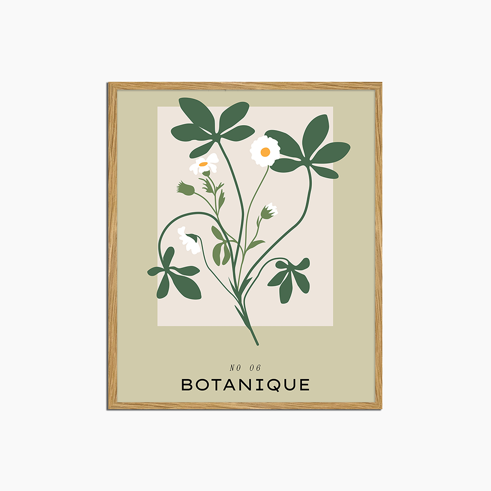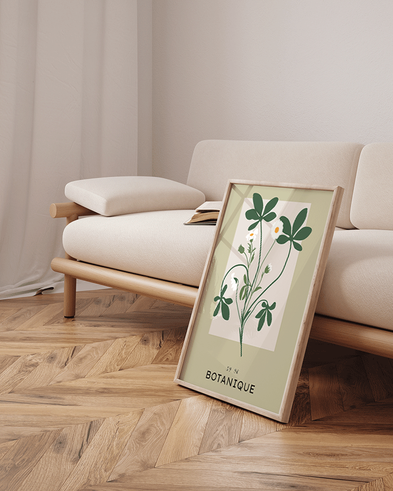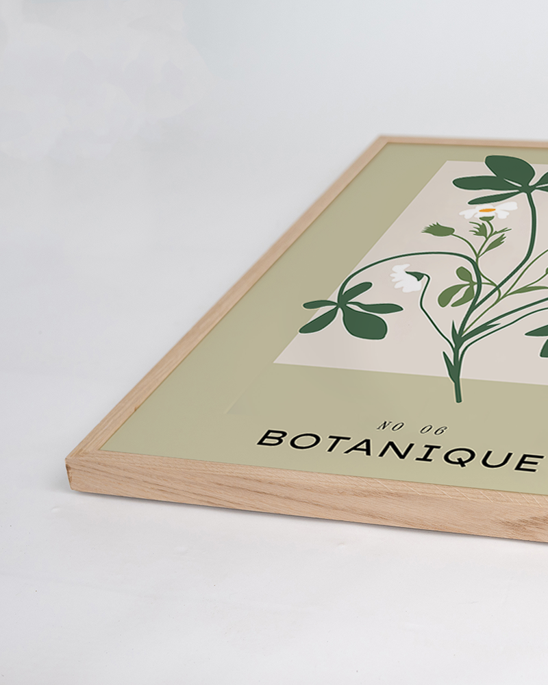 A poster featuring abstract margaritas in various green tones, titled "NO6 Botanique," adds a fresh, botanical touch. It can reflect a person’s taste for sophisticated, nature-inspired art.