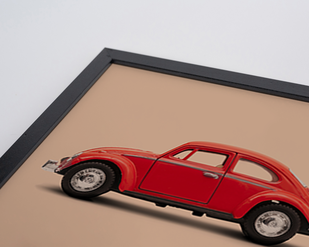 A red vintage Volkswagen Beetle against a creamy vanilla background. The image radiates retro charm and cheerful nostalgia.