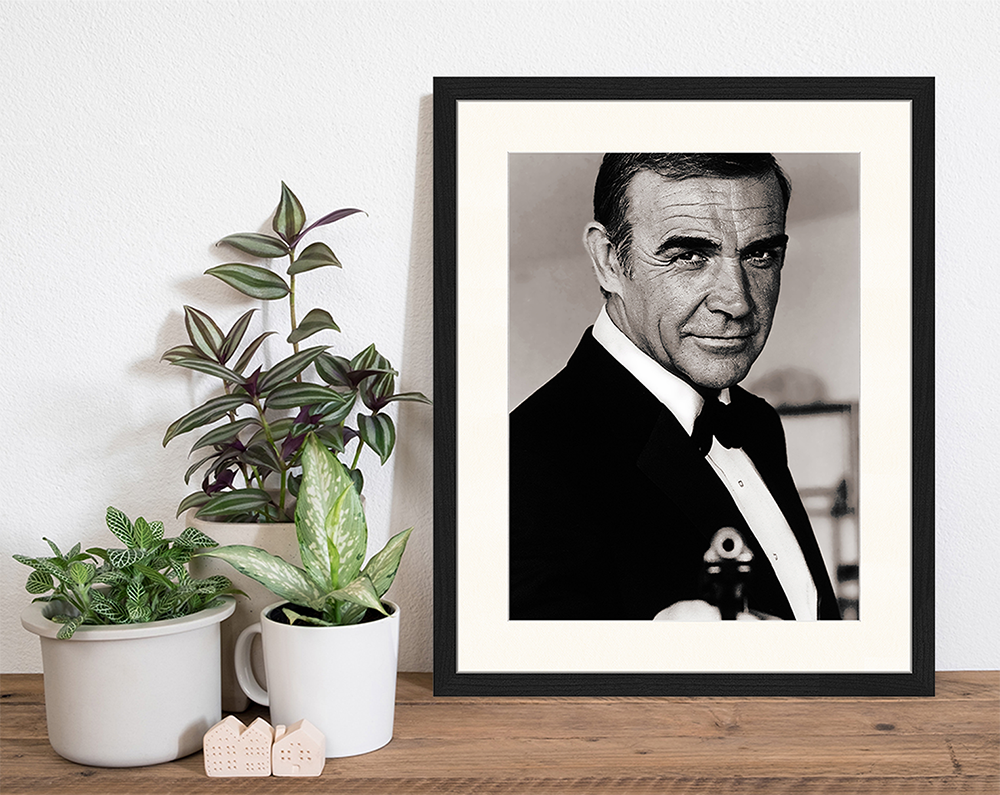 Black and white portrait of Sean Connery as James Bond, confidently pointing a gun with his signature suave expression.