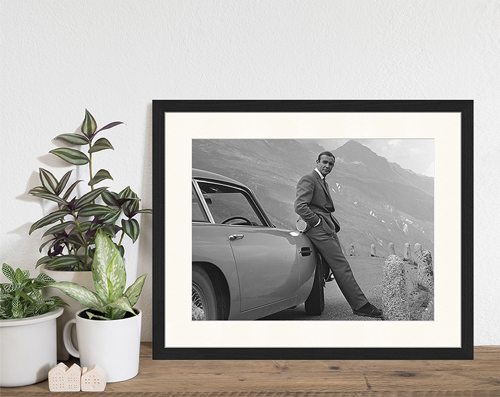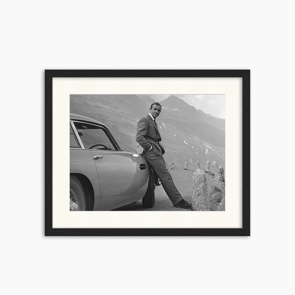This iconic black and white photograph features the legendary Sean Connery as James Bond in the classic 1964 film 'Goldfinger'. It serves as a time capsule, capturing Connery's iconic secret agent 007 during a pivotal moment in cinematic history. 'Goldfinger' marked the debut of the Aston Martin DB5 which will later become a famous James Bond related car.