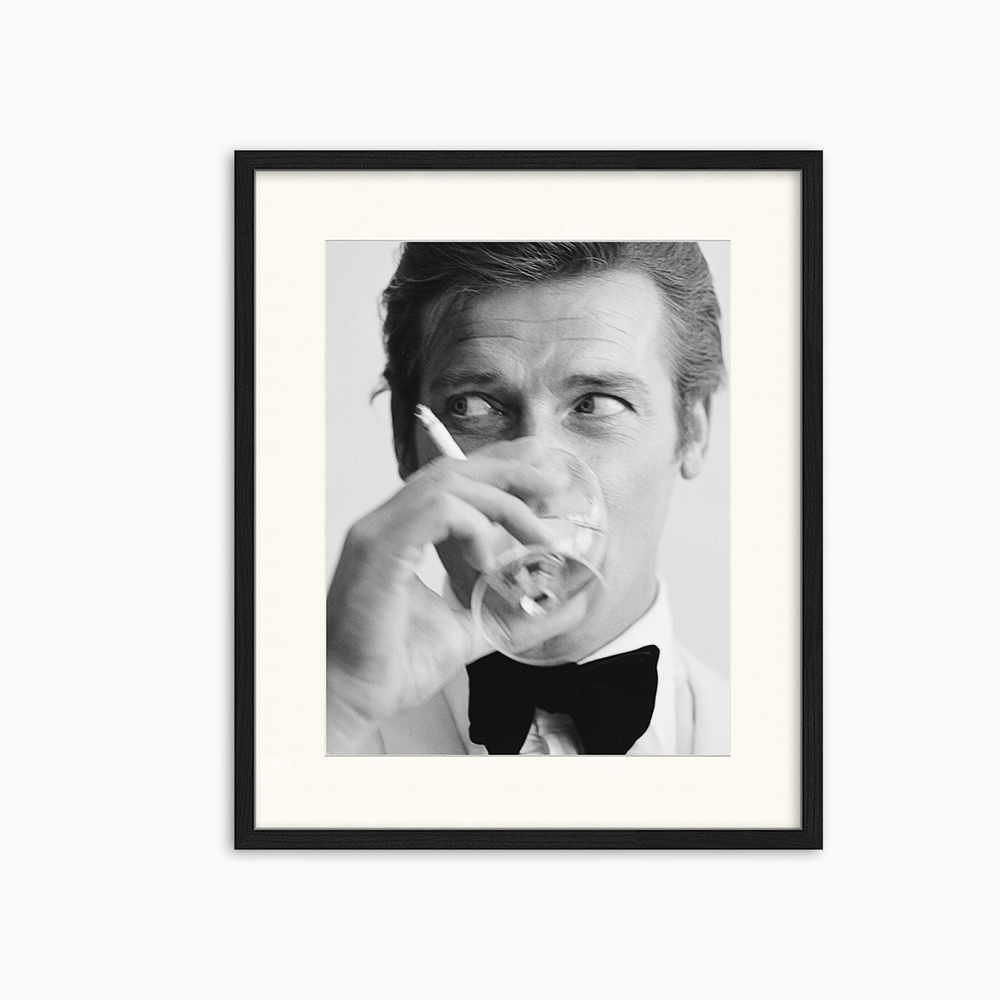 In this famous black and white photo from 1968, Sir Roger Moore is captured enjoying a dry Martini, 'shaken not stirred'. The image shows the timeless charm and charisma that endeared Roger Moore to fans worldwide as James Bond. It serves as a powerful black and white classic image, in which James Bond shows glamour, style, intrigue and refined elegance.