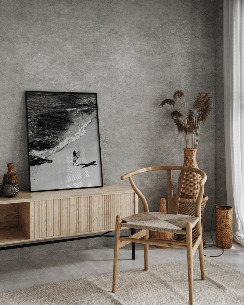 Black and white photograph of a beach scene, capturing a tranquil moment with a woman, carrying a surfboard, walking along the sand towards the water. The aesthetic of the photo brings a fresh and serene atmosphere.