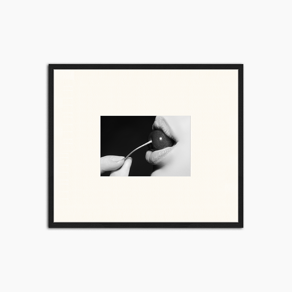 Striking black and white photograph, the focus is on a close-up view of a woman's lips, creating an intimate and provocative atmosphere. The image captures a moment of sensual indulgence as the woman sensuously eats a cherry.