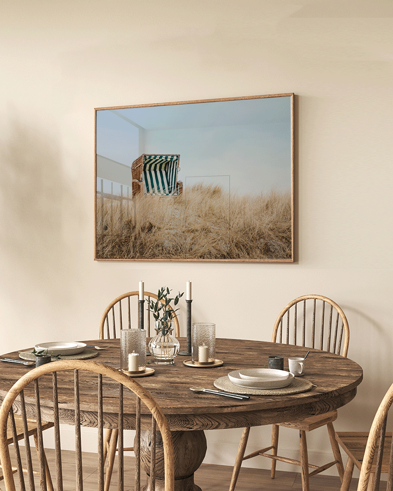 An iconic beach chair stands sentinel next to lush, grown grass, creating a picturesque scene of coastal tranquility.