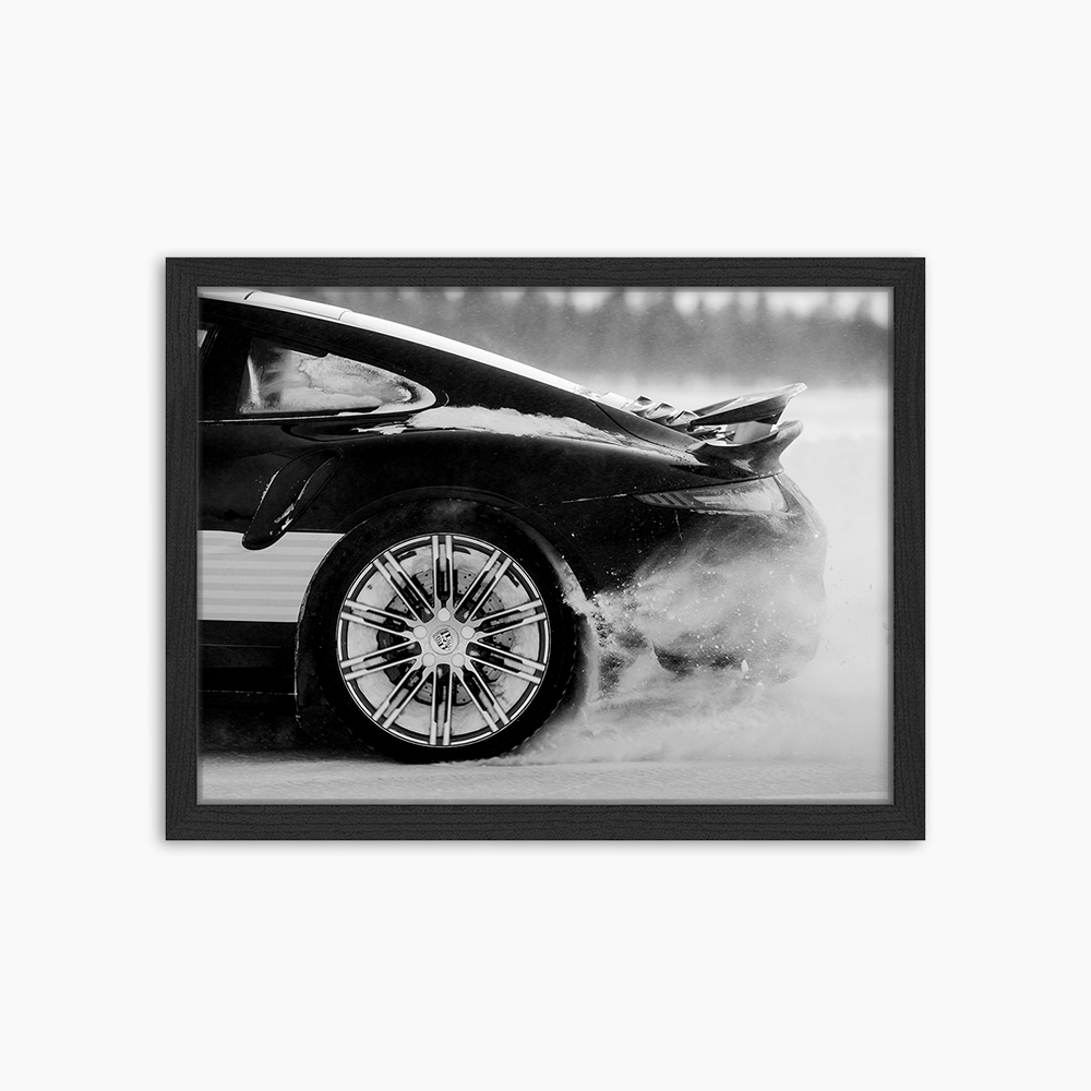 Elegance and adventure meet in this black and white photograph in which the Porsche is captured gracefully gliding through the snow, showcasing the power and grace of the vehicle.